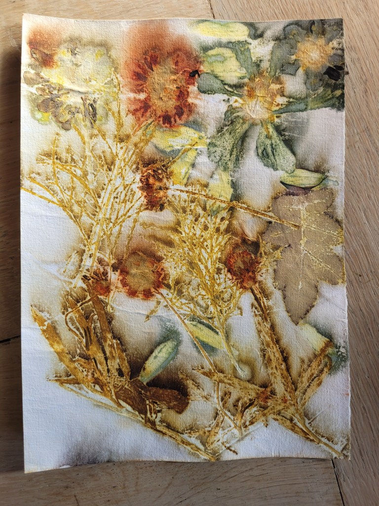 Het resultaat is een unieke, handgemaakte afdruk die de textuur van de bloemen en bladeren vastlegt. Elke ecoprint weerspiegelt op authentieke wijze de schoonheid van de natuur.