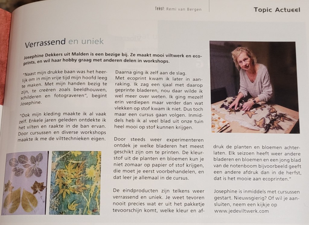 Vanaf vandaag liggen mijn ecoprint artikelen te koop bij warenhuis Strant in Haren (bij Oss) http://www.warenhuisstrant.nlDe Gelderlander – 27 januari 2022Nieuwe technieken leren bij Ellen Rikken. Juli 2023Kunstroute Heumen 2025